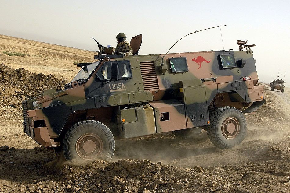 An Australian designed and made Bushmaster infantry mobility vehicle from the Al Muthanna Task Group moves off a dirt track to rendezvous with soldiers from the Australian Army Training Team - Iraq in the wastelands south of Al Khidr in the Al Muthanna province. The Bushmaster has proven to be very popular with the Australian soldiers due to its armour protection, powerful CAT engine, air conditioning and interior space.
